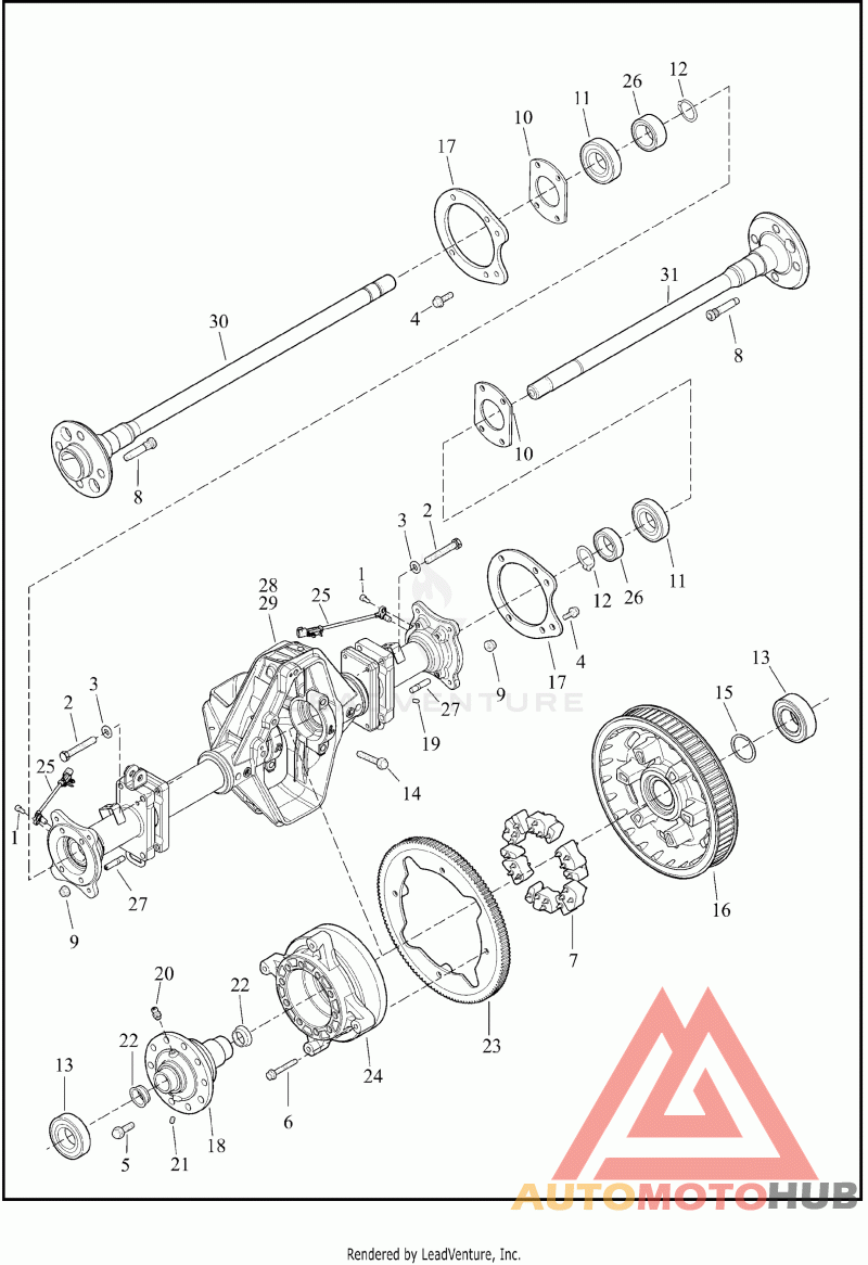 Деталь AXLE,RR,ASSY | rear, with reverse, with 4, 5, 6, 7, 13, 14, 15, 16, 17, 18, 19, 23, 24, 28, 30, 31